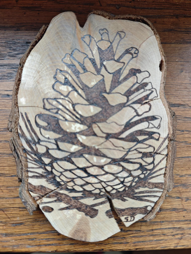 Cette création représente une pomme de pin finement pyrogravée à la main sur une tranche de bois naturel.