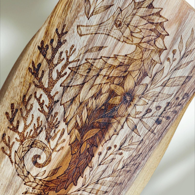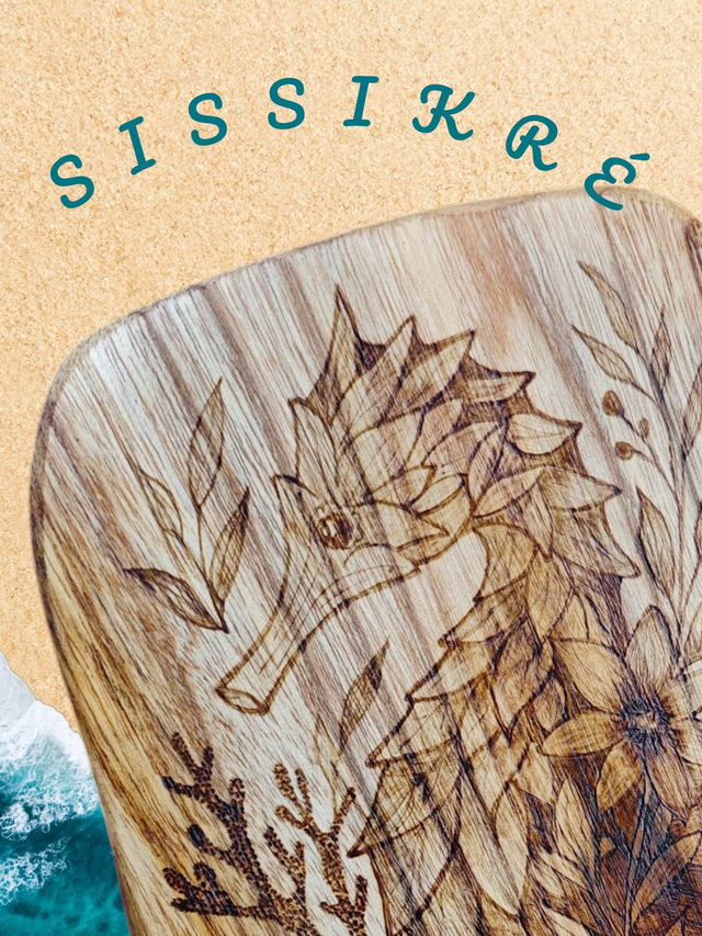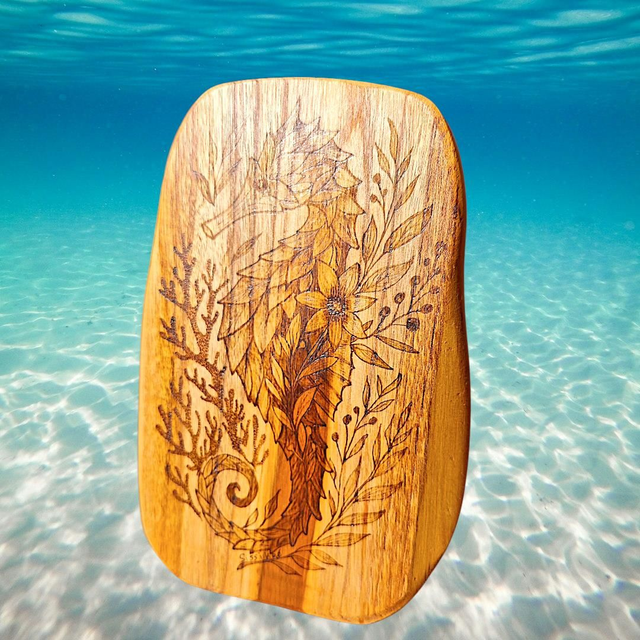 Sissikré vous propose une pièce artisanale unique : une planche en teck massif, décorée d’un hippocampe végétalisé entièrement réalisé en pyrogravure.